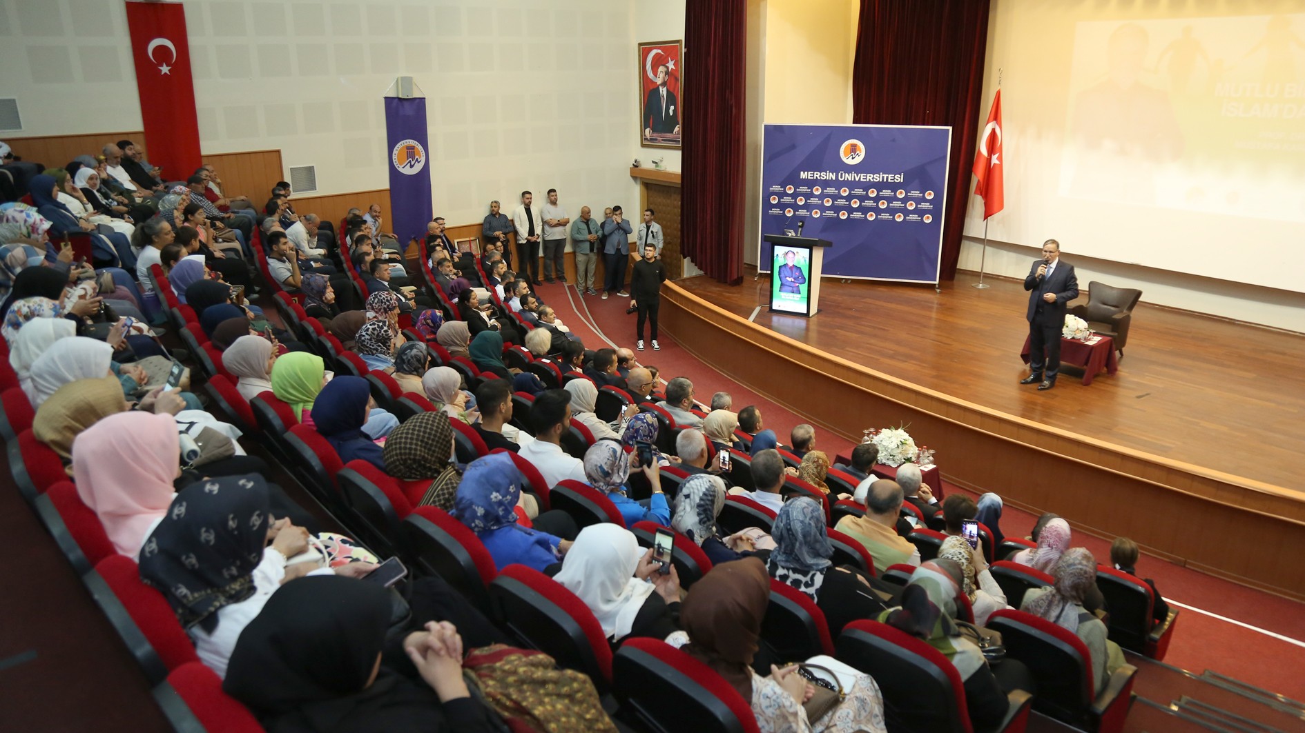 Cuma namazının ardından, Üniversitemiz Prof. Dr. Uğur Oral Kültür Merkezi’nde gerçekleştirilen konferansa geçildi. Konferansa; Rektörümüz Prof. Dr. Erol Yaşar, Rektör Yardımcımız Prof. Dr. Mehmet Çağrı Çetin, Mersin İl Müftüsü Aydın Yığman, Mersin Aile ve Sosyal Hizmetler İl Müdürü Naci Yılmaz, sivil toplum kuruluşlarının temsilcileri, Rektör Danışmanlarımız, Daire Başkanlarımız, akademik ve idari personelimiz ile öğrencilerimiz katıldı.