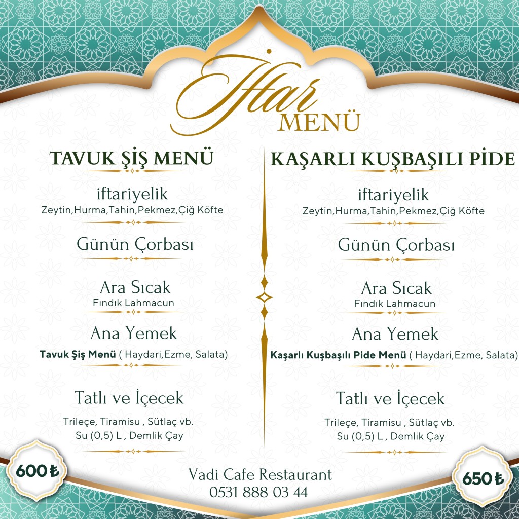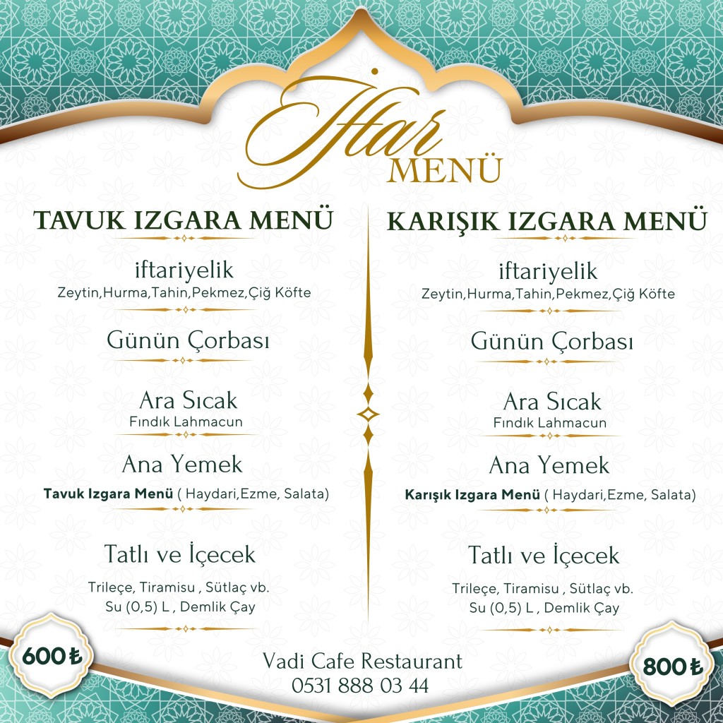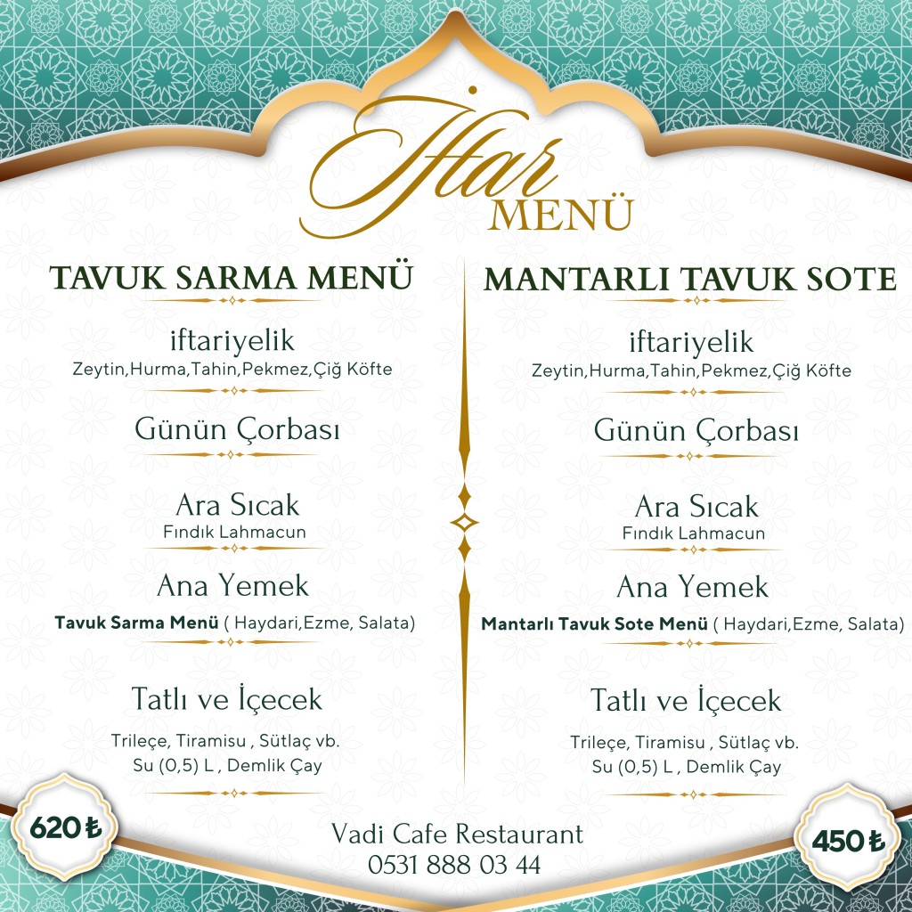 Özenle hazırladığımız iftar menülerimiz; geleneksel iftariyeliklerden sıcak çorbalara, ara lezzetlerden ana yemek ve tatlı çeşitlerine kadar dengeli, doyurucu ve özenle planlanmıştır. Her detayında kalite, her sunumunda titizlik bulunan menülerimizle Ramazan akşamlarınıza lezzet katıyoruz.